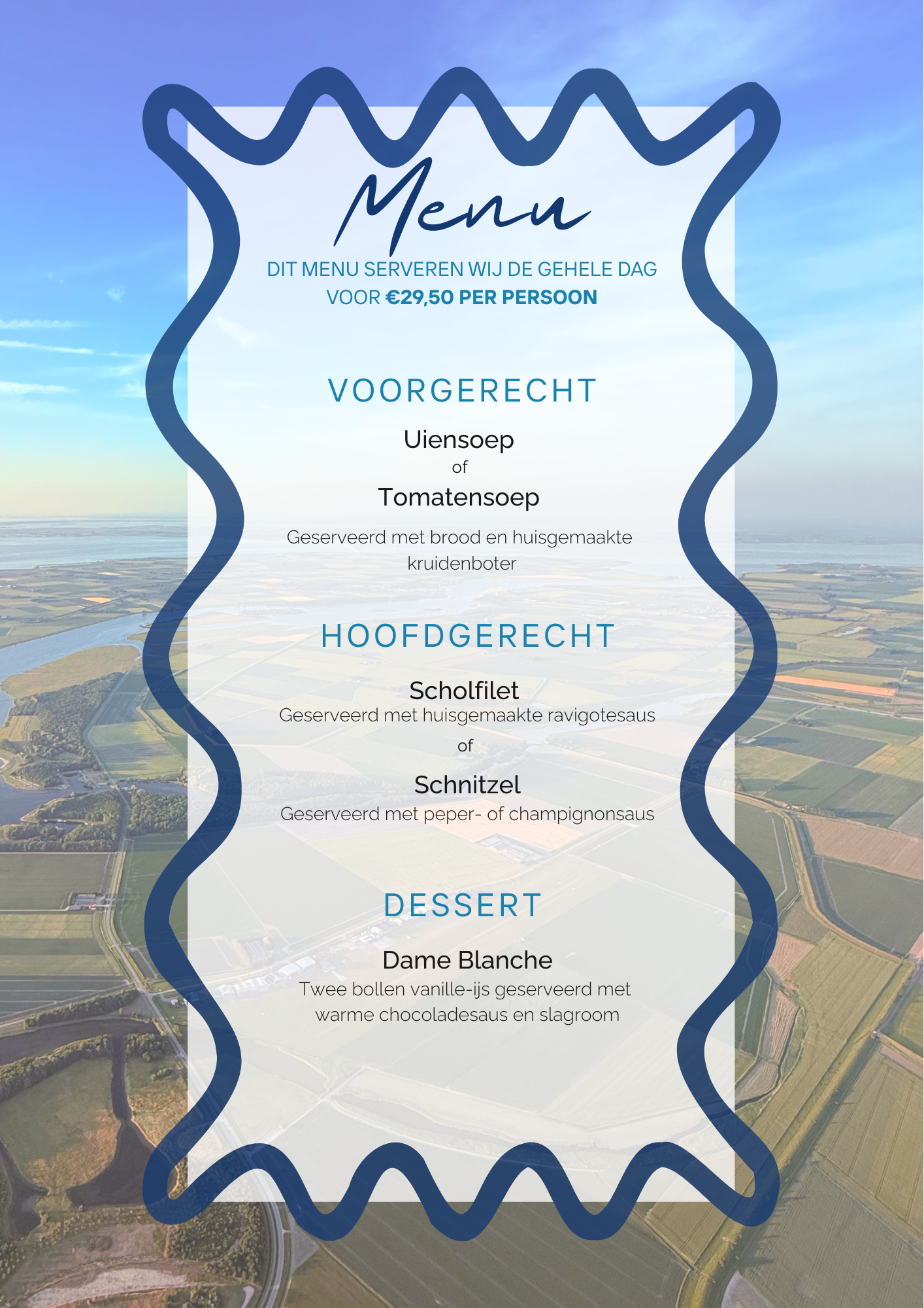 Of u nu komt lunchen of dineren, dit menu wordt dagelijks de gehele dag door geserveerd. Ideaal voor een ontspannen lunchpauze, een gezellig etentje na het werk, of gewoon omdat je jezelf eens lekker wil verwennen.